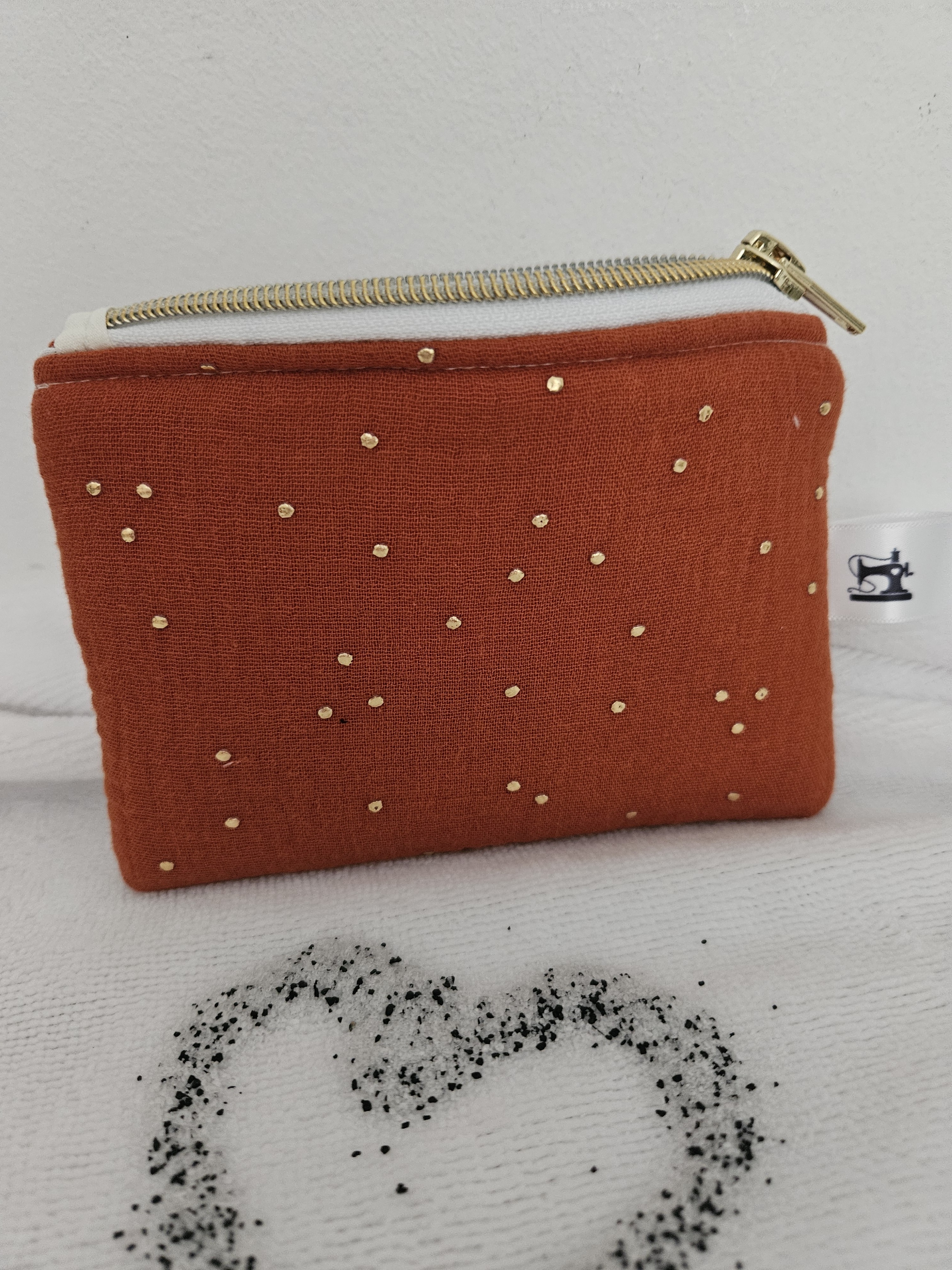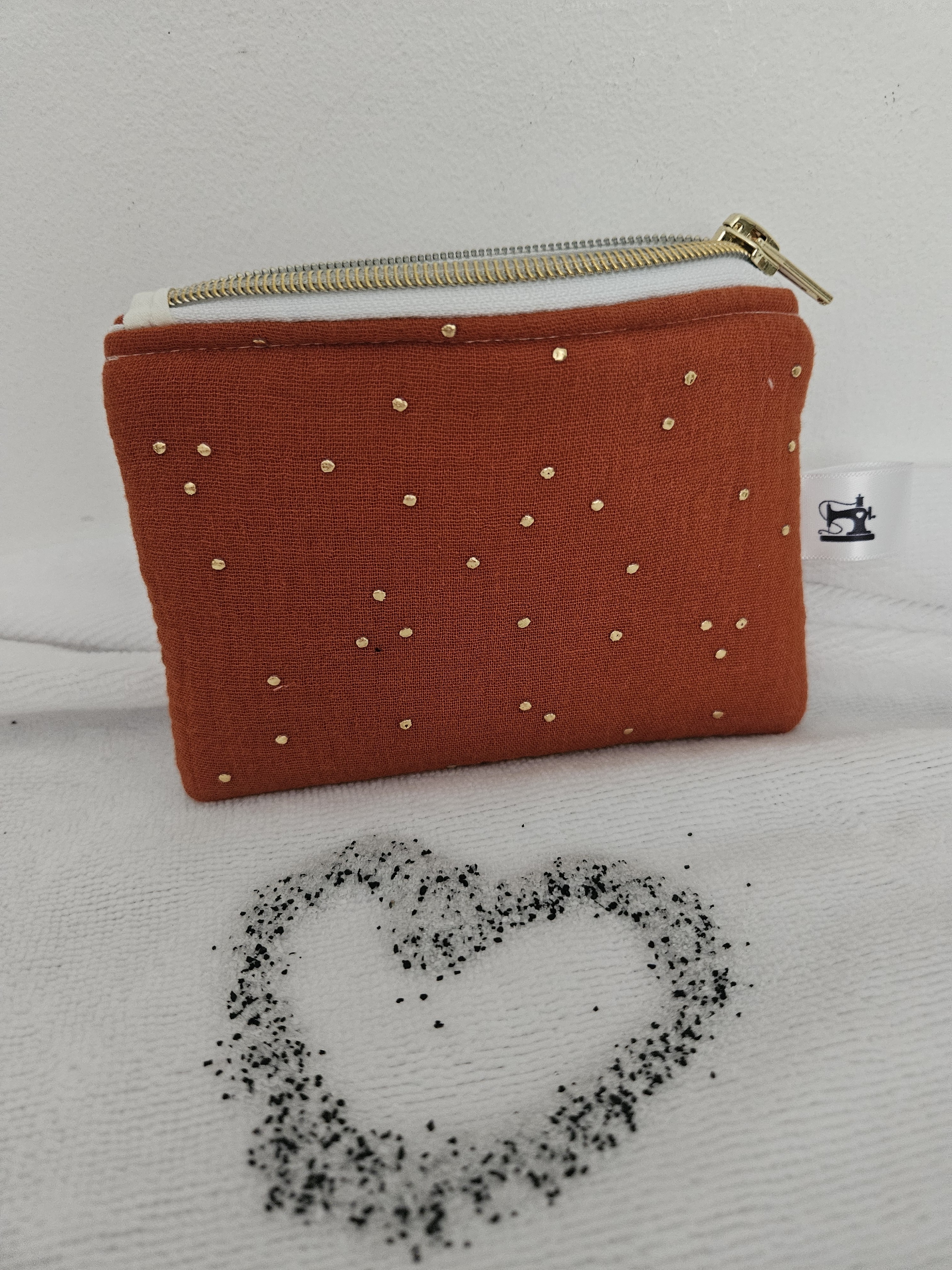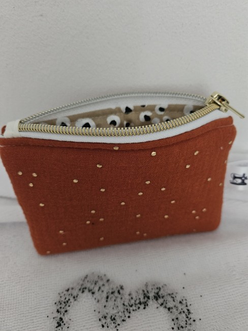 Porte monnaie réalisé en Tissus double gaze à pois dorés.