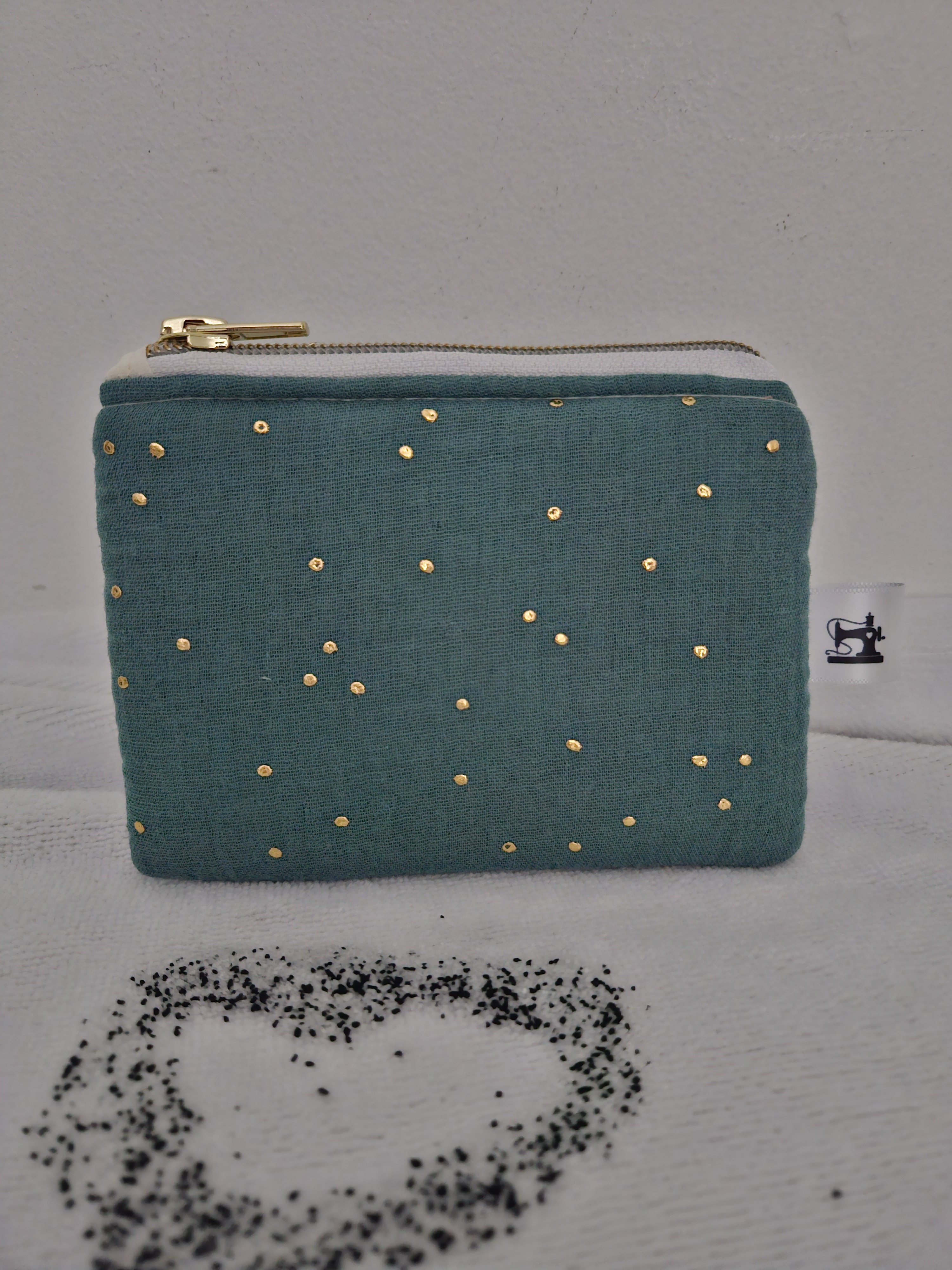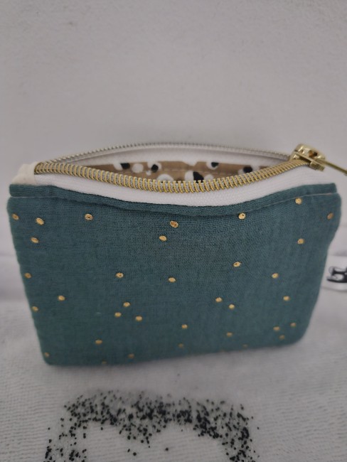 Porte monnaie réalisé en Tissus double gaze à pois dorés.