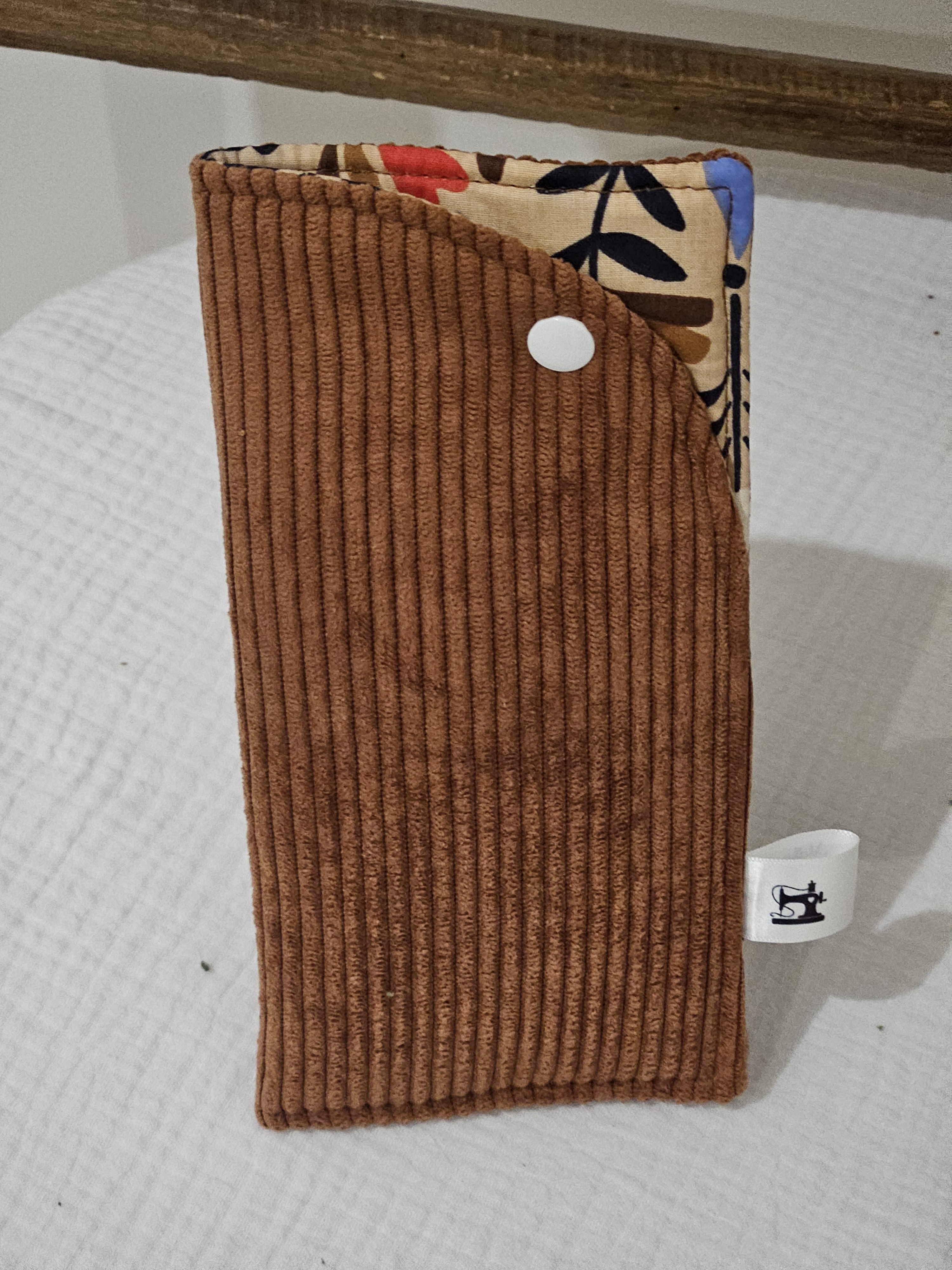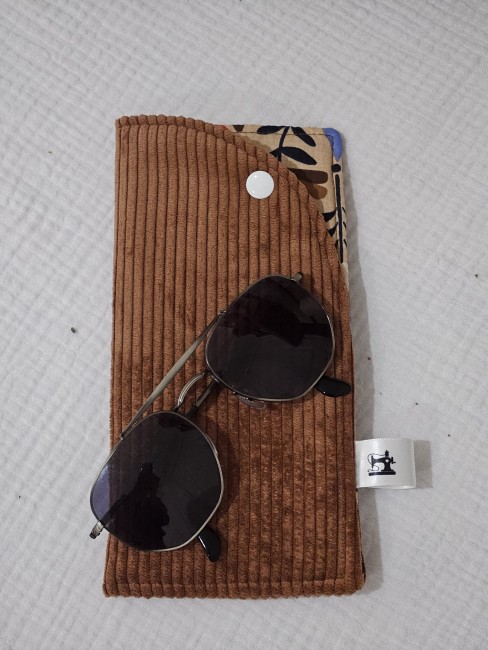 Étui à lunettes réalisé en velours côtelé d'ameublement.