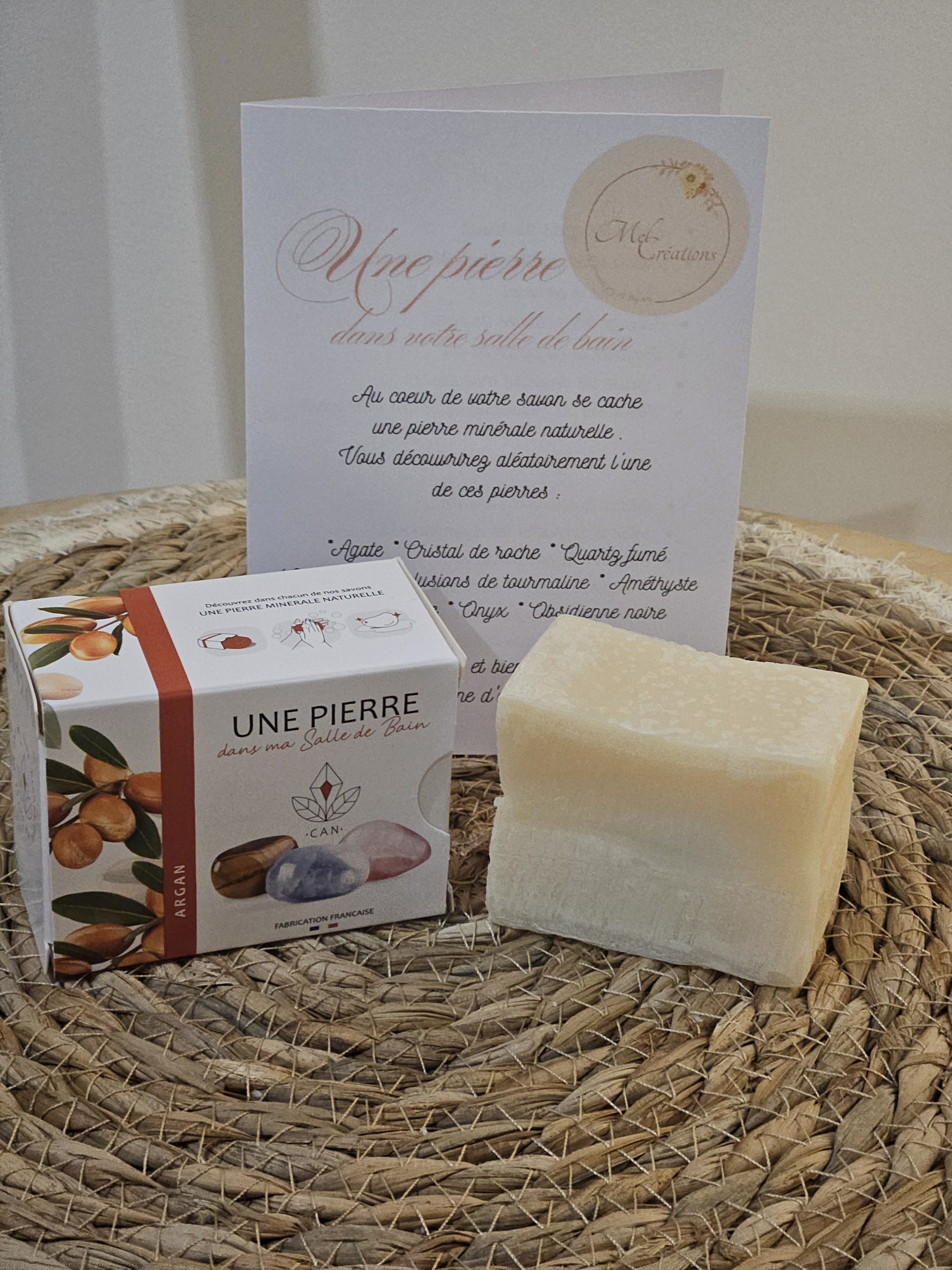 Un savon qui cache en son centre une pierre naturelle .
