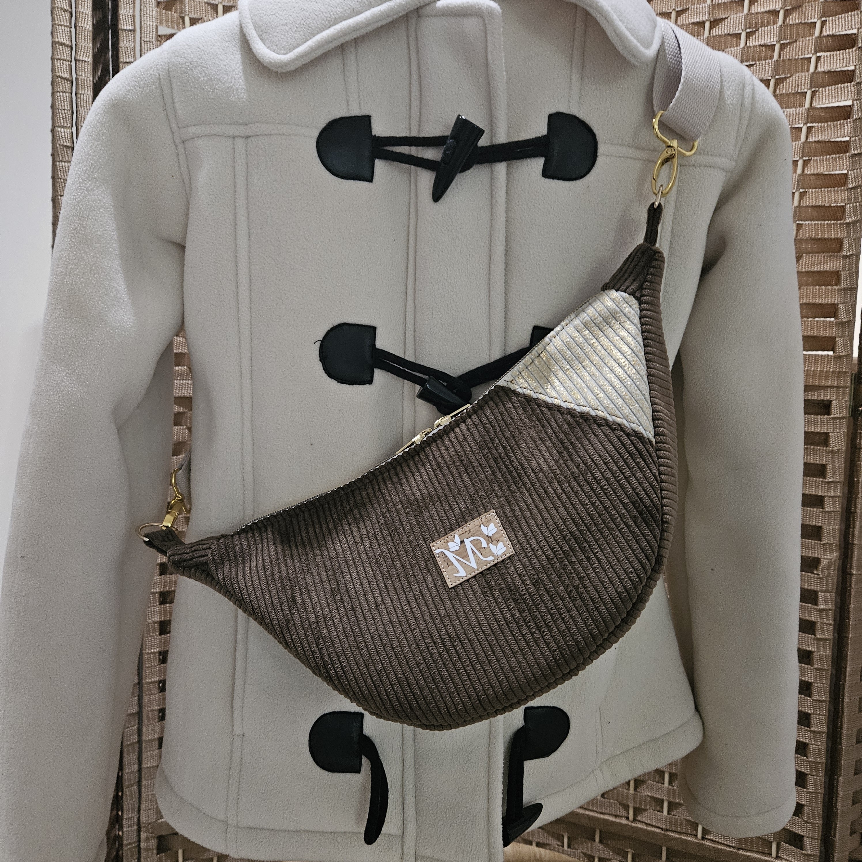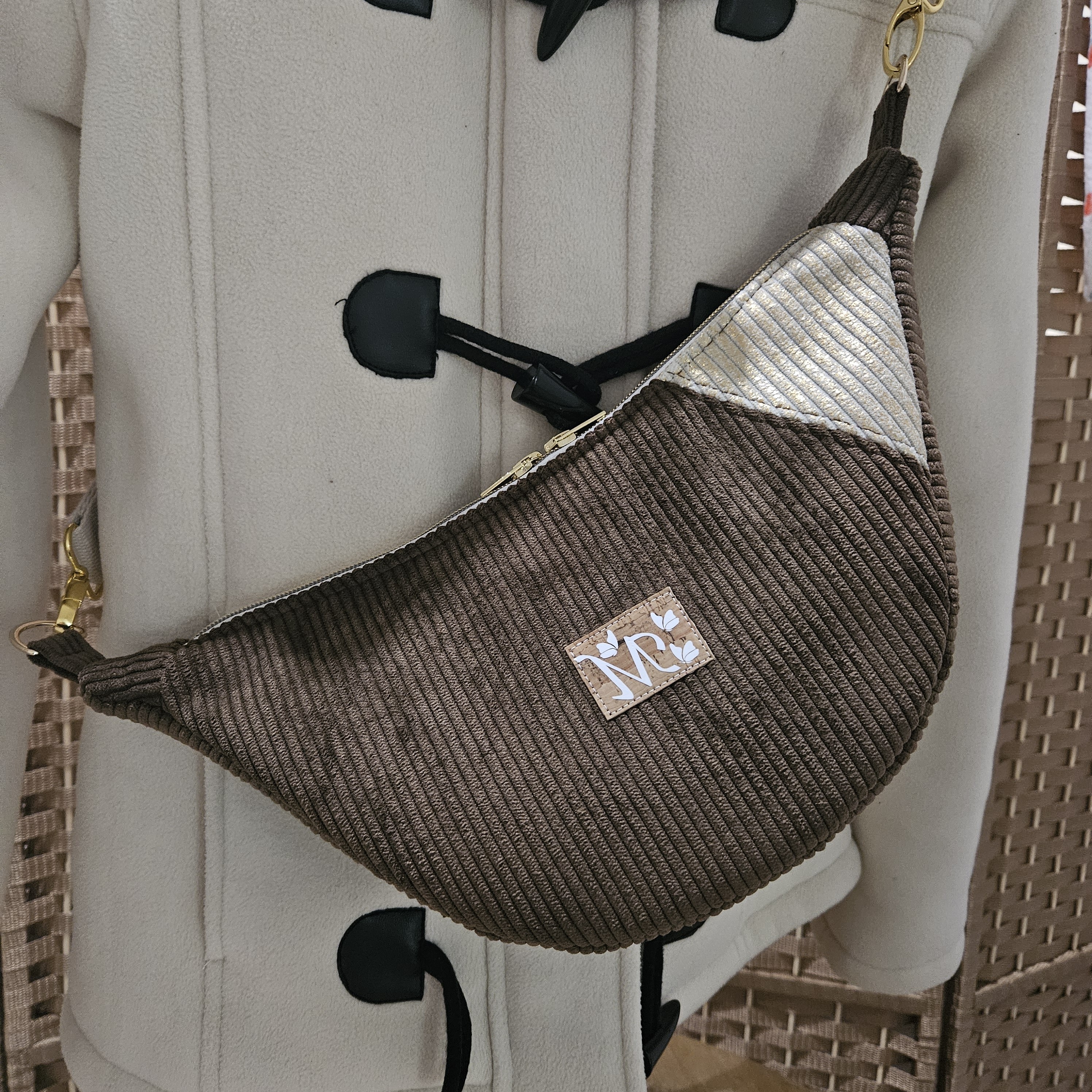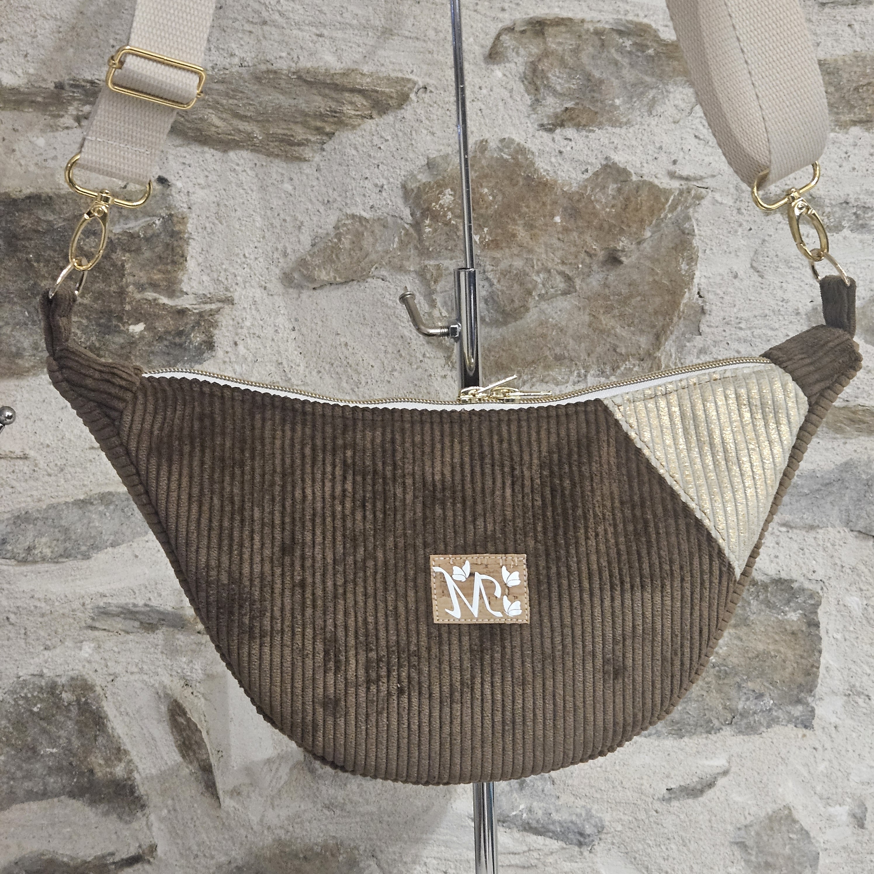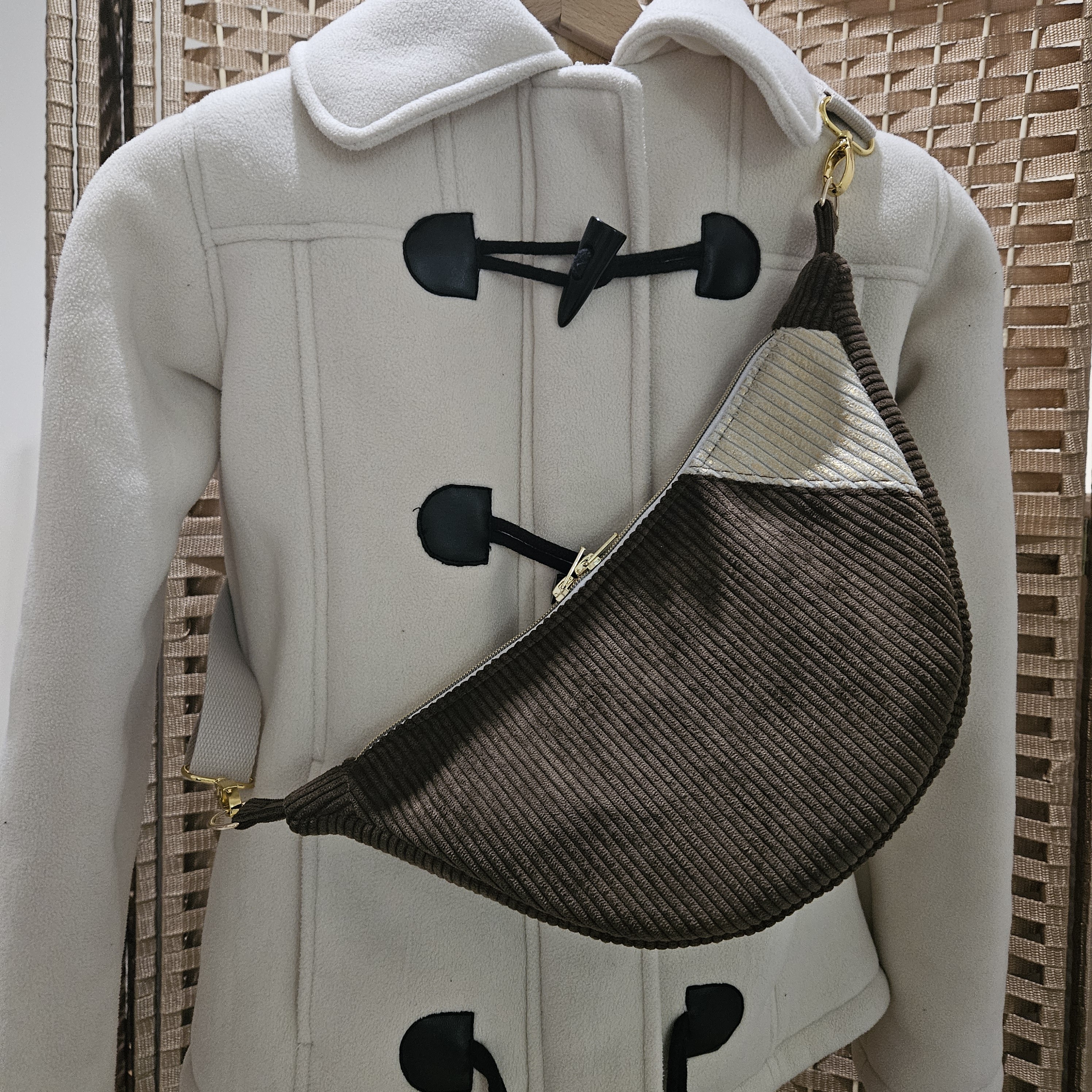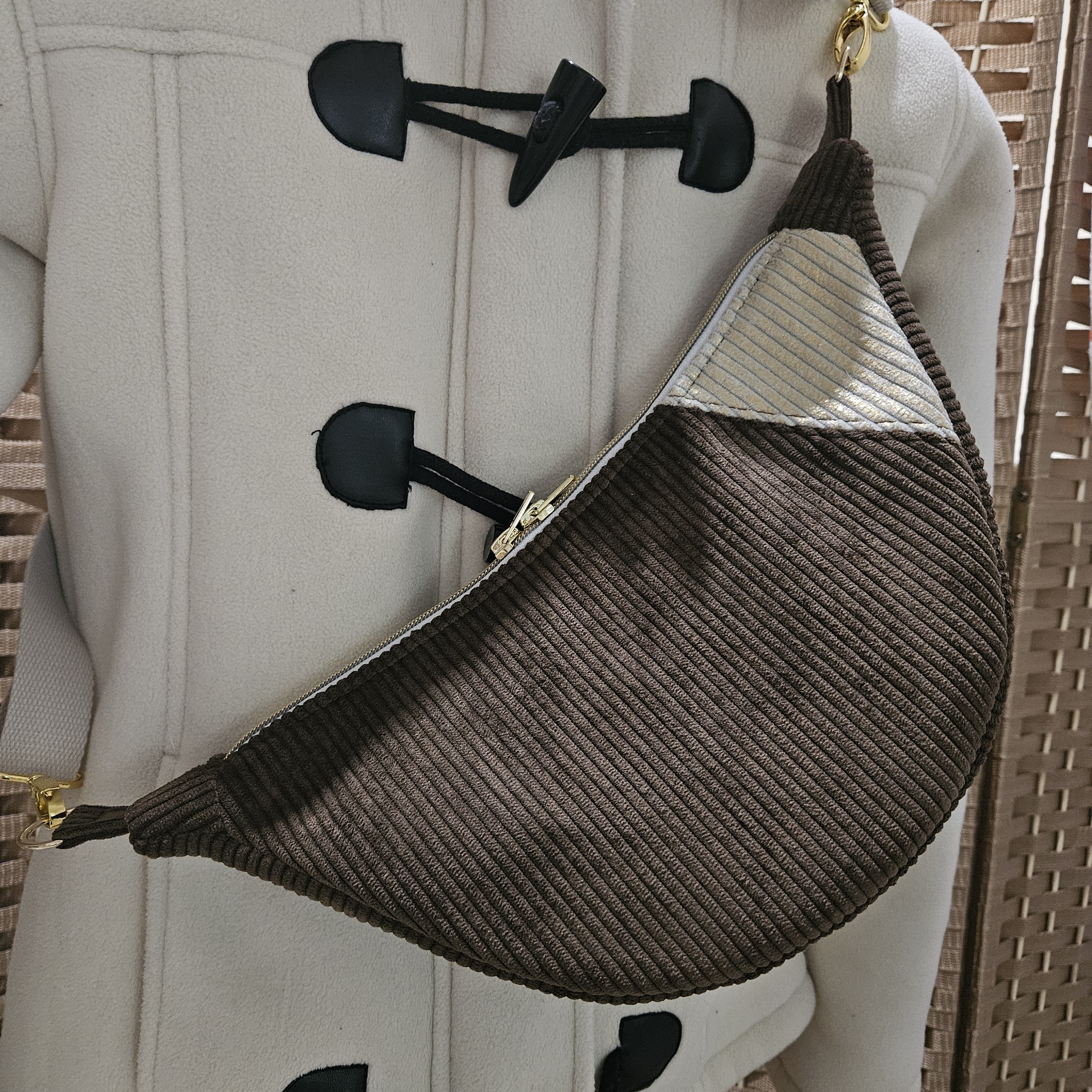 Coloris chocolat avec un contraste beige lurex doré.