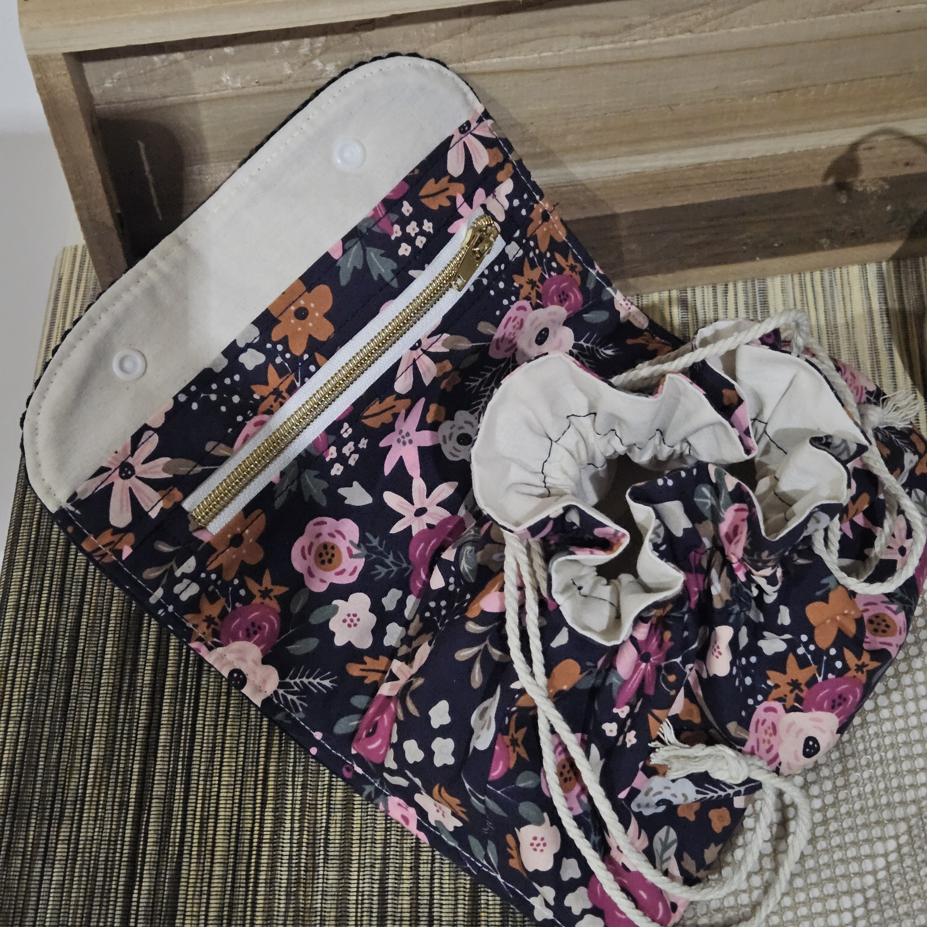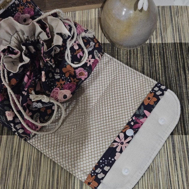 fermée par bouton pression , et un pochon central qui se referme par liens coulissants.