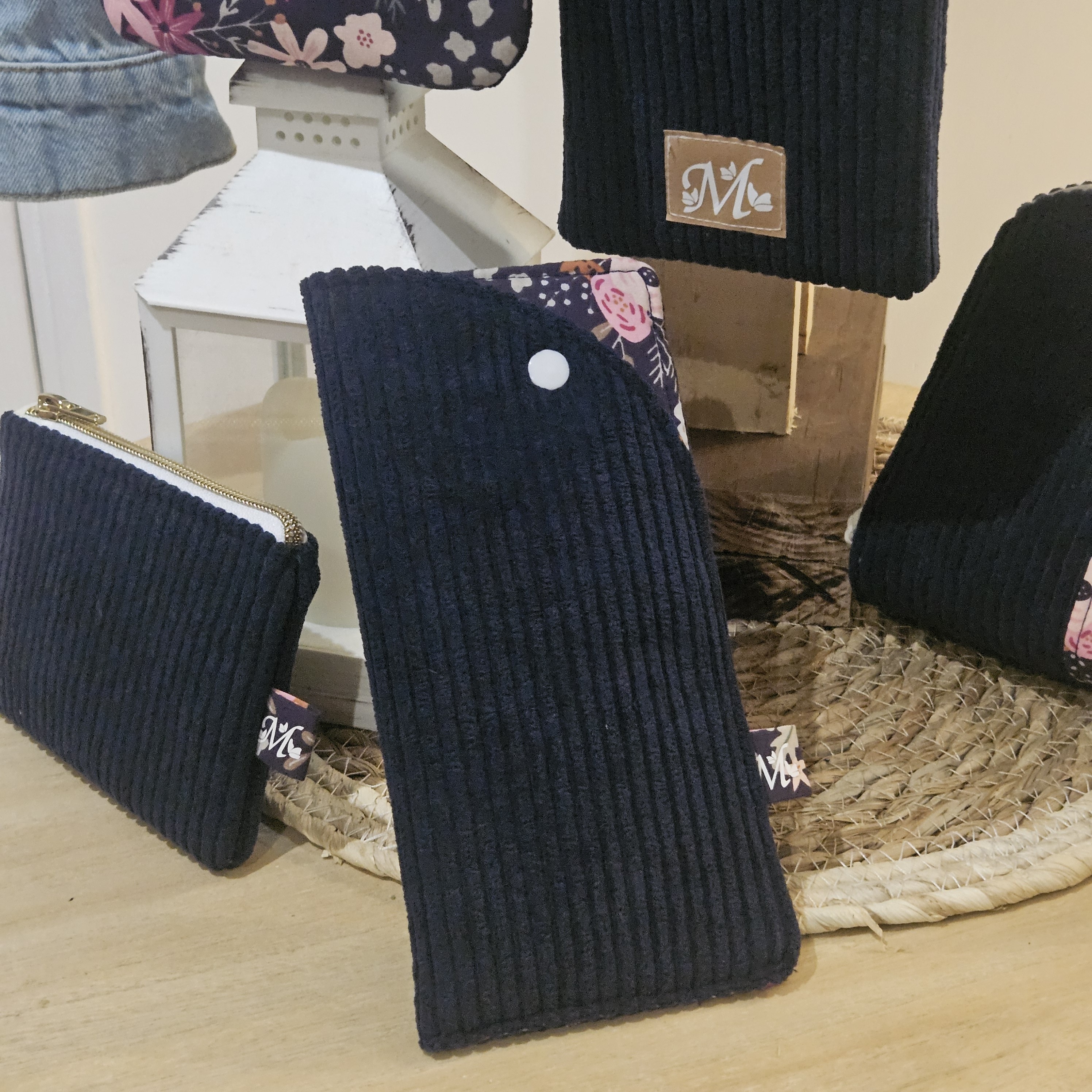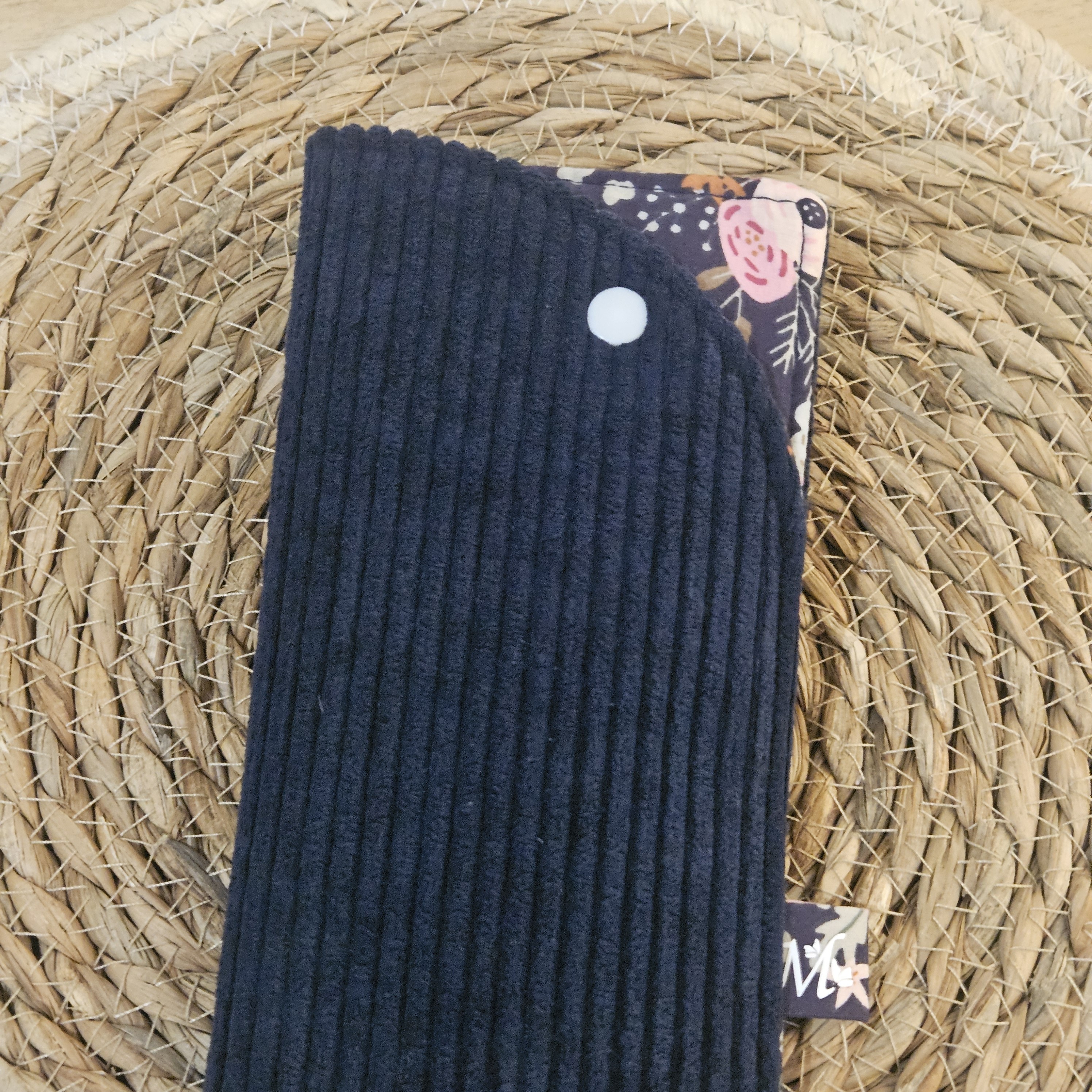 Étui à lunettes réalisé en velours côtelé d’ameublement.