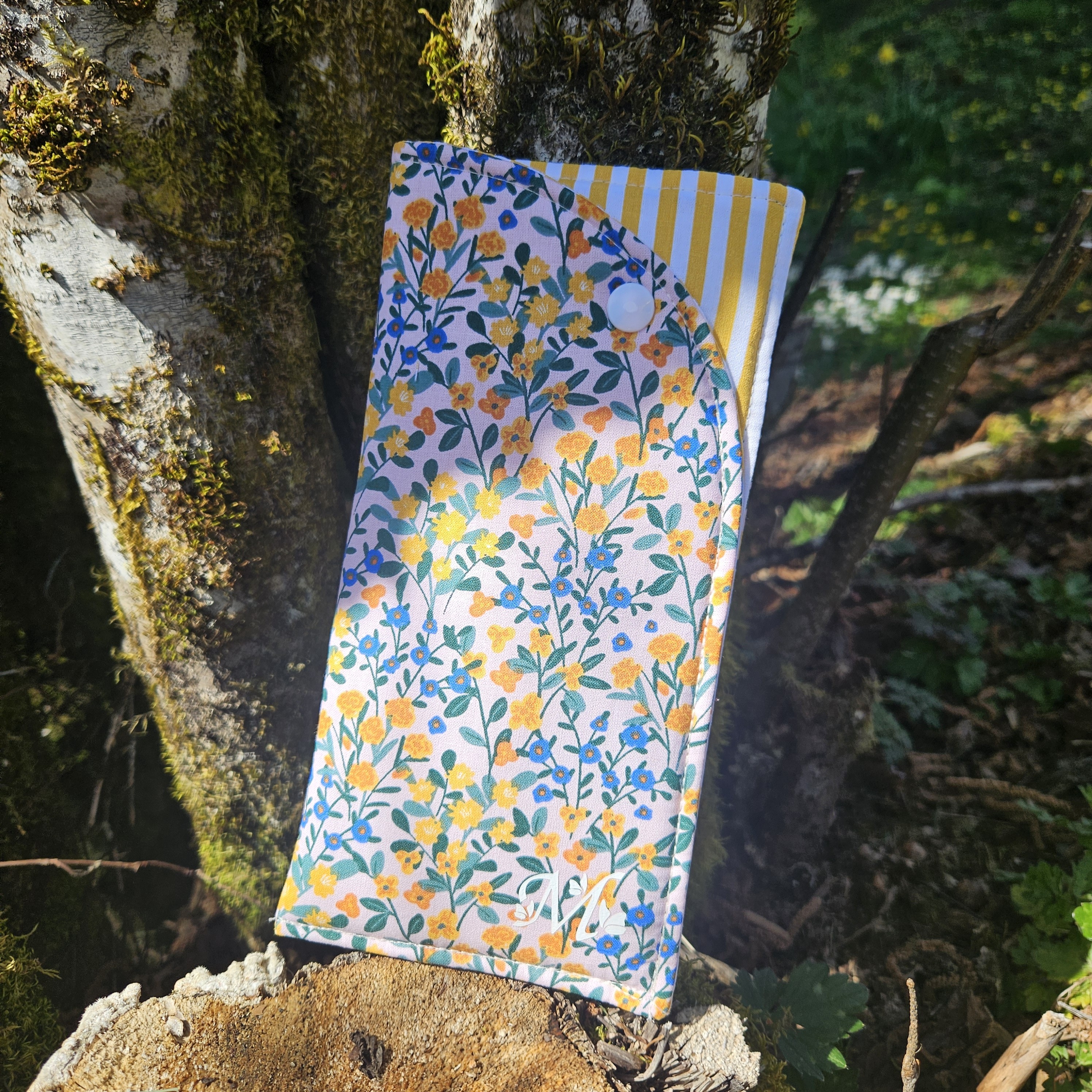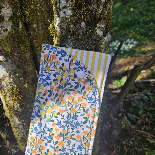 Étui à lunettes réalisé en coton imprimé pour l’intérieur et l’extérieur.