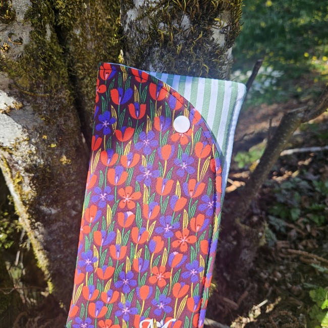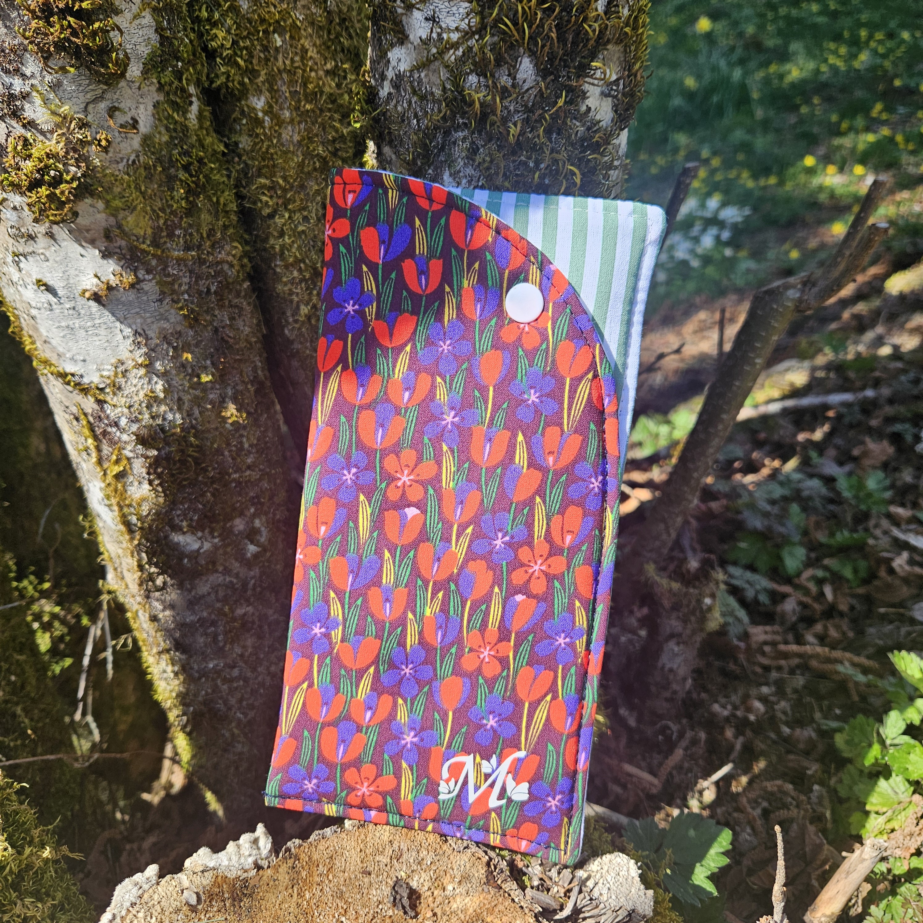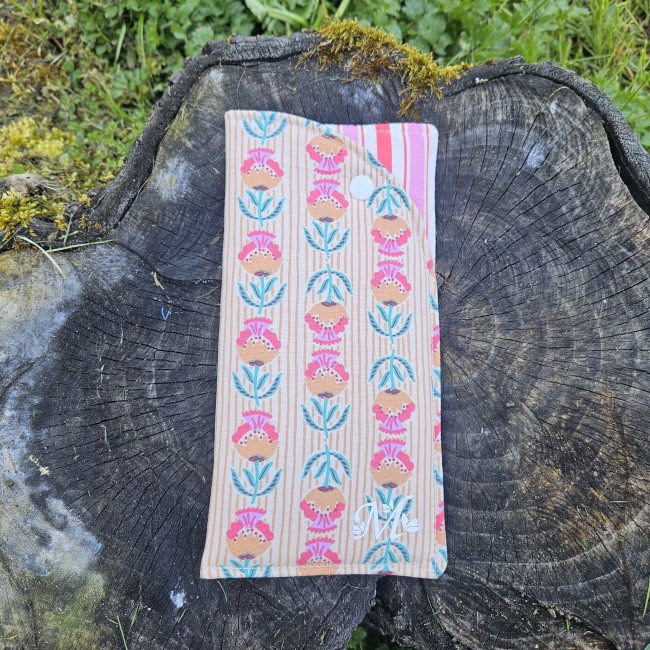 Étui à lunettes réalisé en coton imprimé pour l’intérieur et l’extérieur.